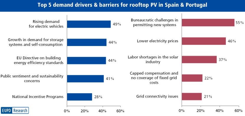 | | | | | | | | | | In EUPD Research's latest PV & ESS InstallerMonitor© 2024/2025, PV installers from Portugal and Spain revealed what drives and hinders their local PV rooftop market. According to the surveyed installers, some of the main demand drivers for rooftop PV are the rising demand for EVs (49%) as well as for storage systems and self-consumption (44%). Meanwhile, the leading barriers were stated to be bureaucratic challenges in permitting new systems (55%) and lower electricity prices (46%). | | | | | |